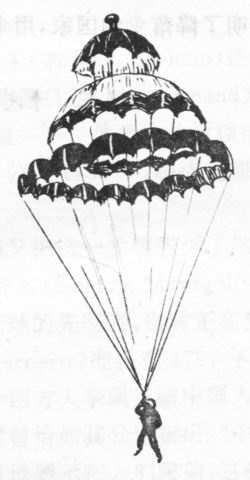 中国人在中世纪使用降落伞的例子,叙述了1192年在广州亲眼目睹的一些事情。那时候云集了不少阿拉伯人,他们曾亲自看到过中国人使用降落伞。法国人西蒙在《历史性的关系》一书中也说过,他曾亲眼看到过中国人使用降落伞表演杂技。中国确实是发明降落伞的国家,用伞当作降落伞是其古老的传统!西方人利诺曼德于1783年,多次从树顶或房顶上跳下去,结果很成功,他把这叫降落伞;这比中国人发明降落伞晚了一千九百多年。