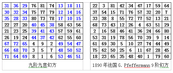 3n 阶九宫幻方系列的阶数虽然是无穷大的,但系列中幻方的基本幻境特性一致。用 1890年法国G. Pfeffermann的九阶幻方与 九阶九宫幻方进行对比。
